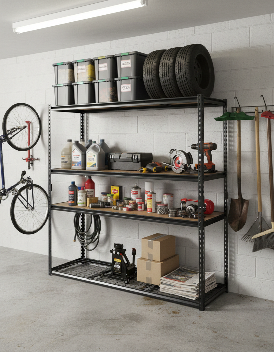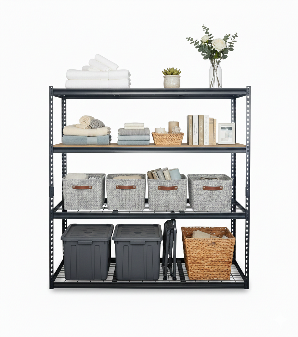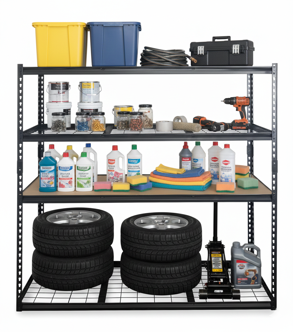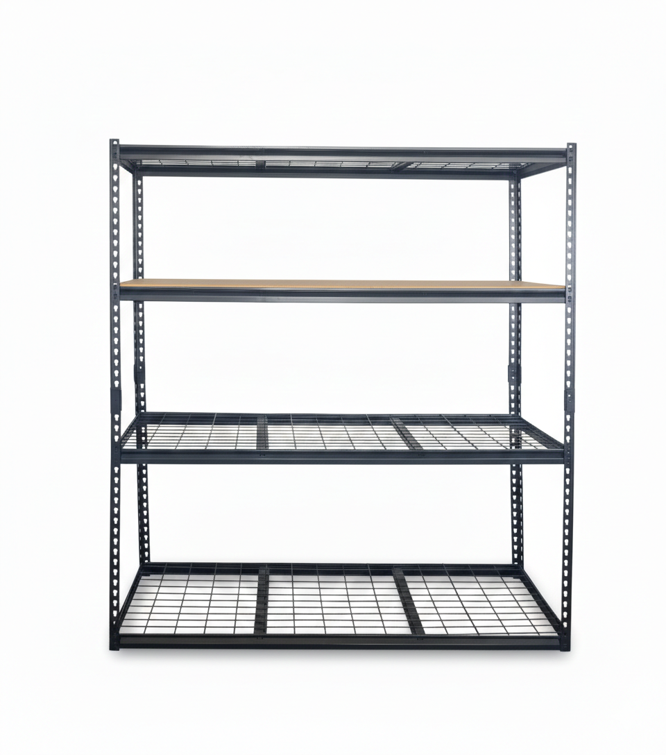 - A freestanding, 4-tier steel rack designed for high-capacity storage in garages, warehouses, or workshops.