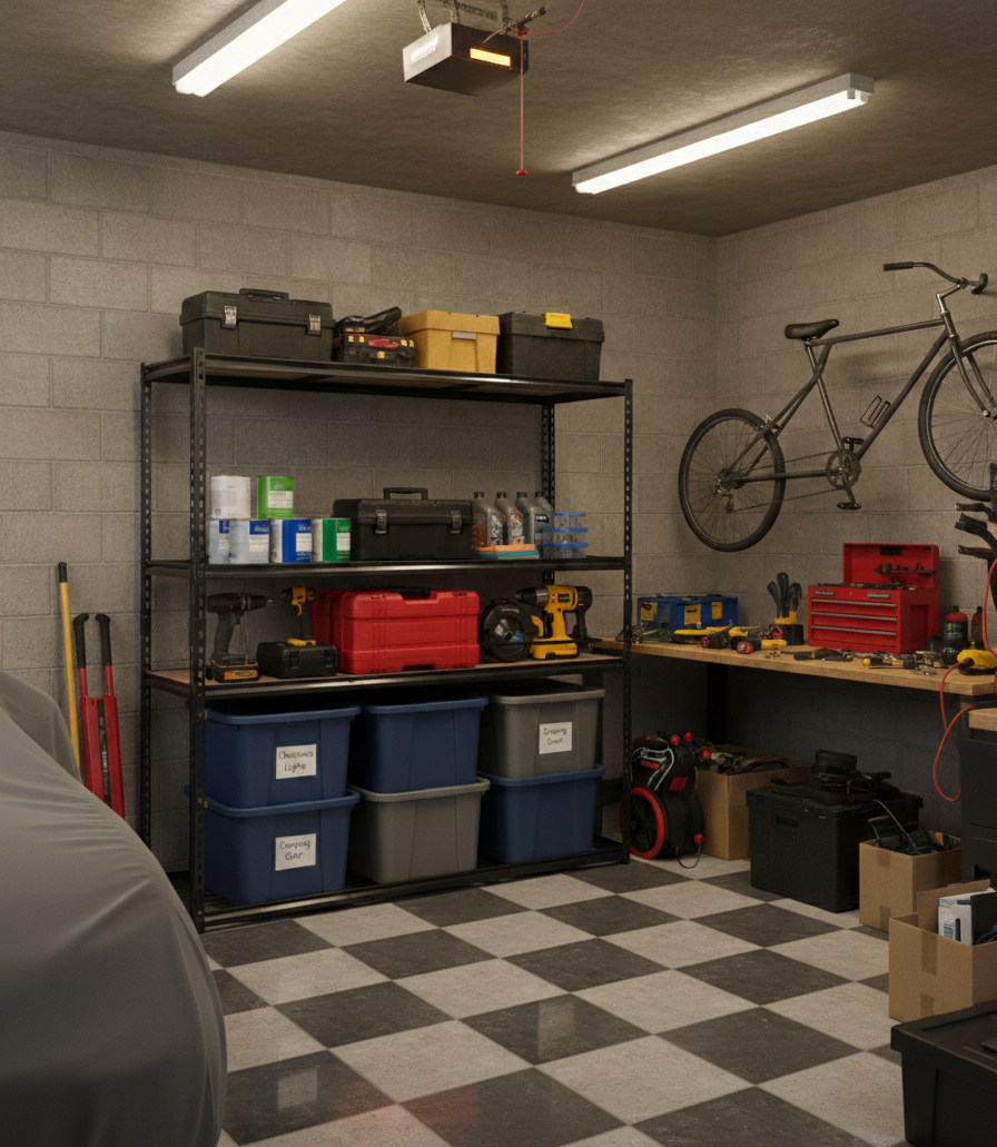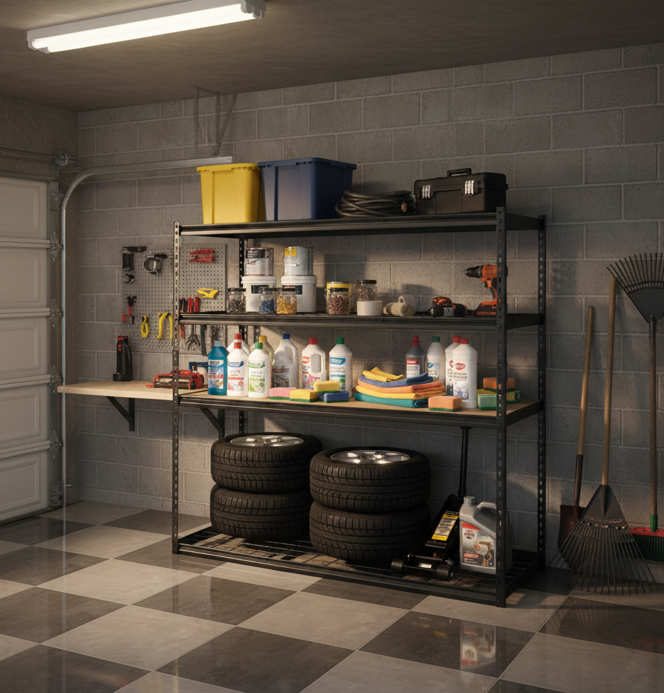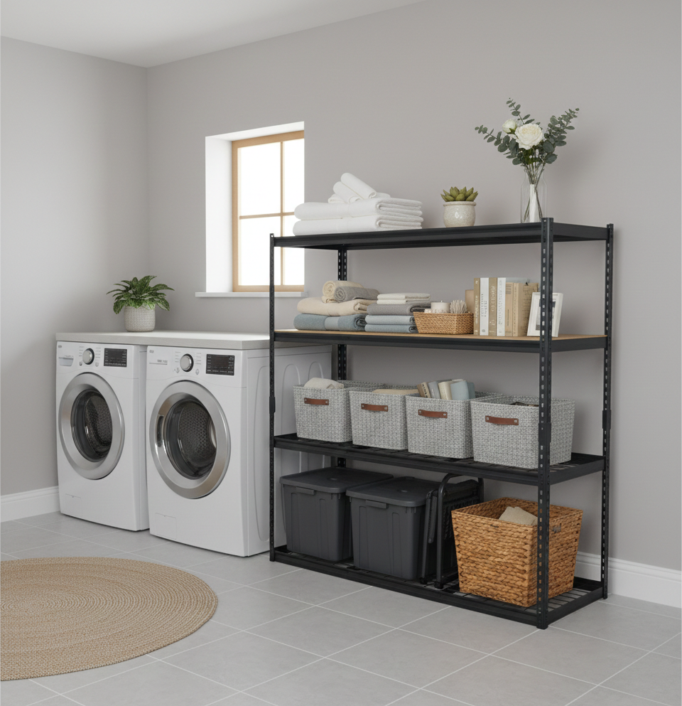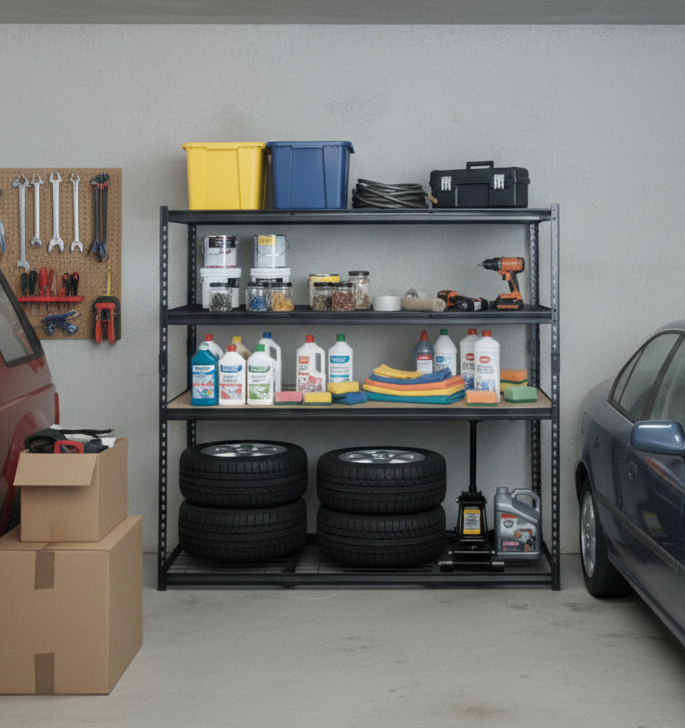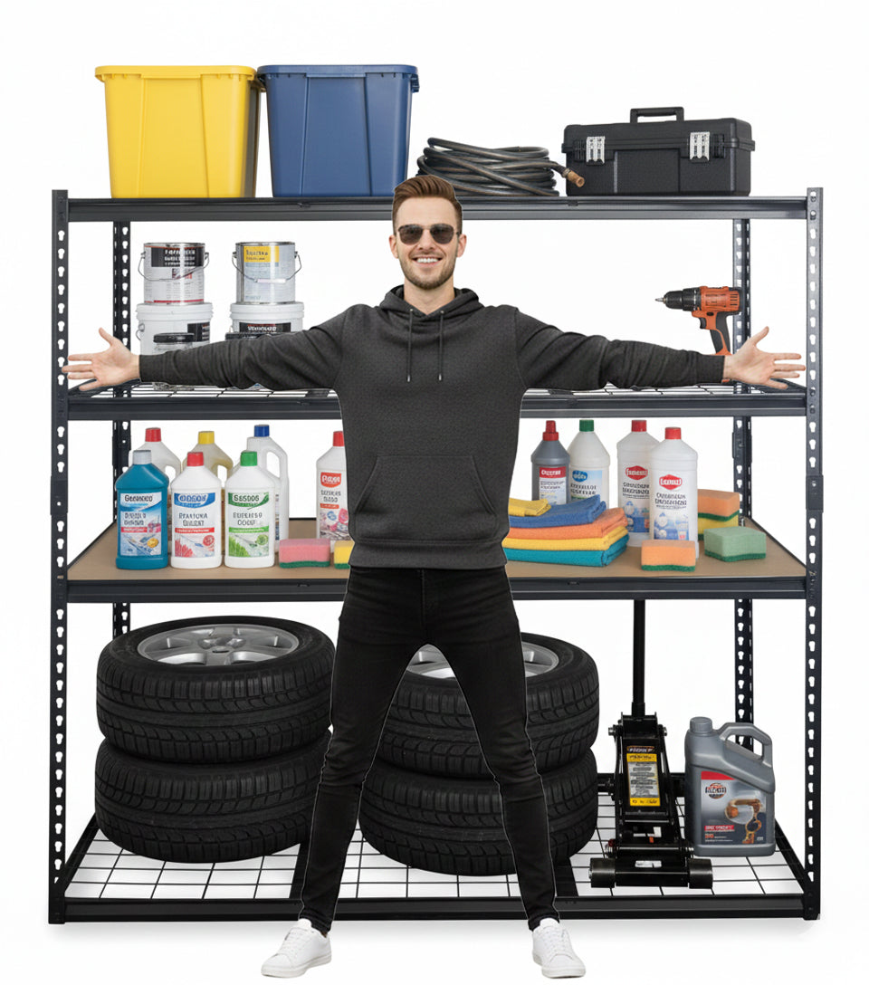 - A freestanding, 4-tier steel rack designed for high-capacity storage in garages, warehouses, or workshops.
