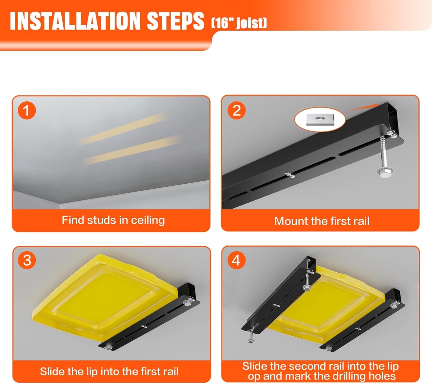 • Convenient Overhead Storage-Mounts securely to 16" ceiling joists for quick installation. Made to fit standard storage bins (bins not included). Hassle-free mounting allows quick and easy overhanging storage solution.
