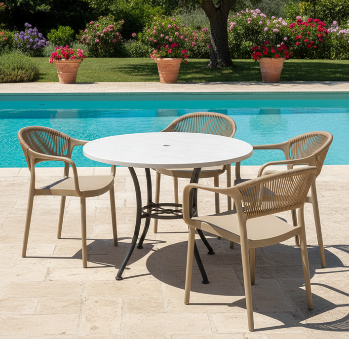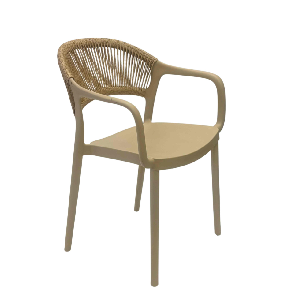 - The armchair has everything you would want from such a piece of furniture. The entire armchair is made of one-piece polypropylene with a slightly curved back upholstered in synthetic (p.p.) rope, and practical arms.