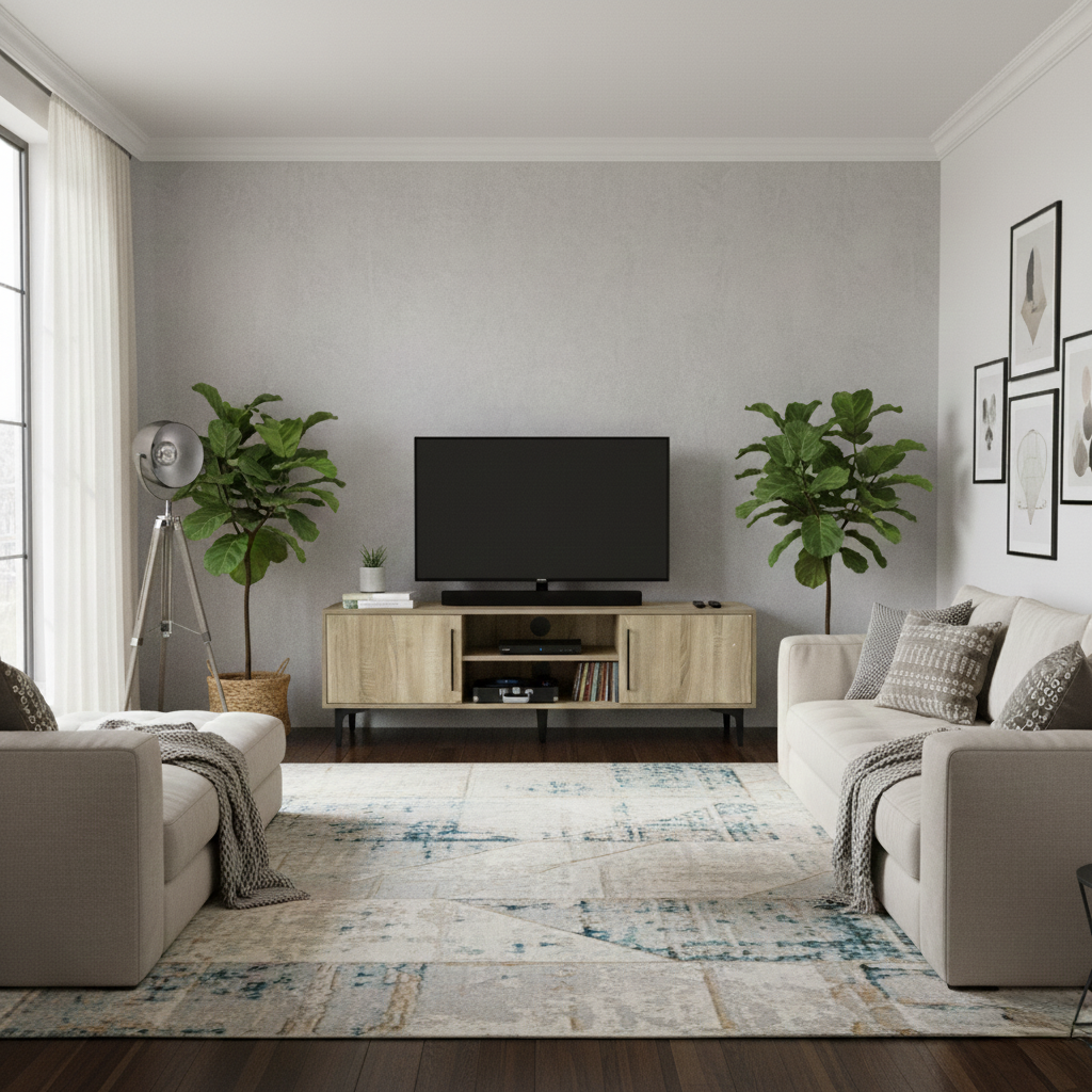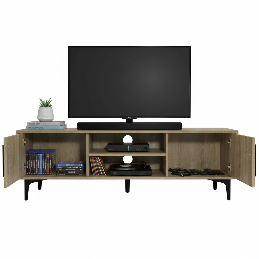Well-designed storage layout: open shelving for easy access to consoles and devices, plus closed storage (drawers or cabinets) to keep clutter out of sight.
