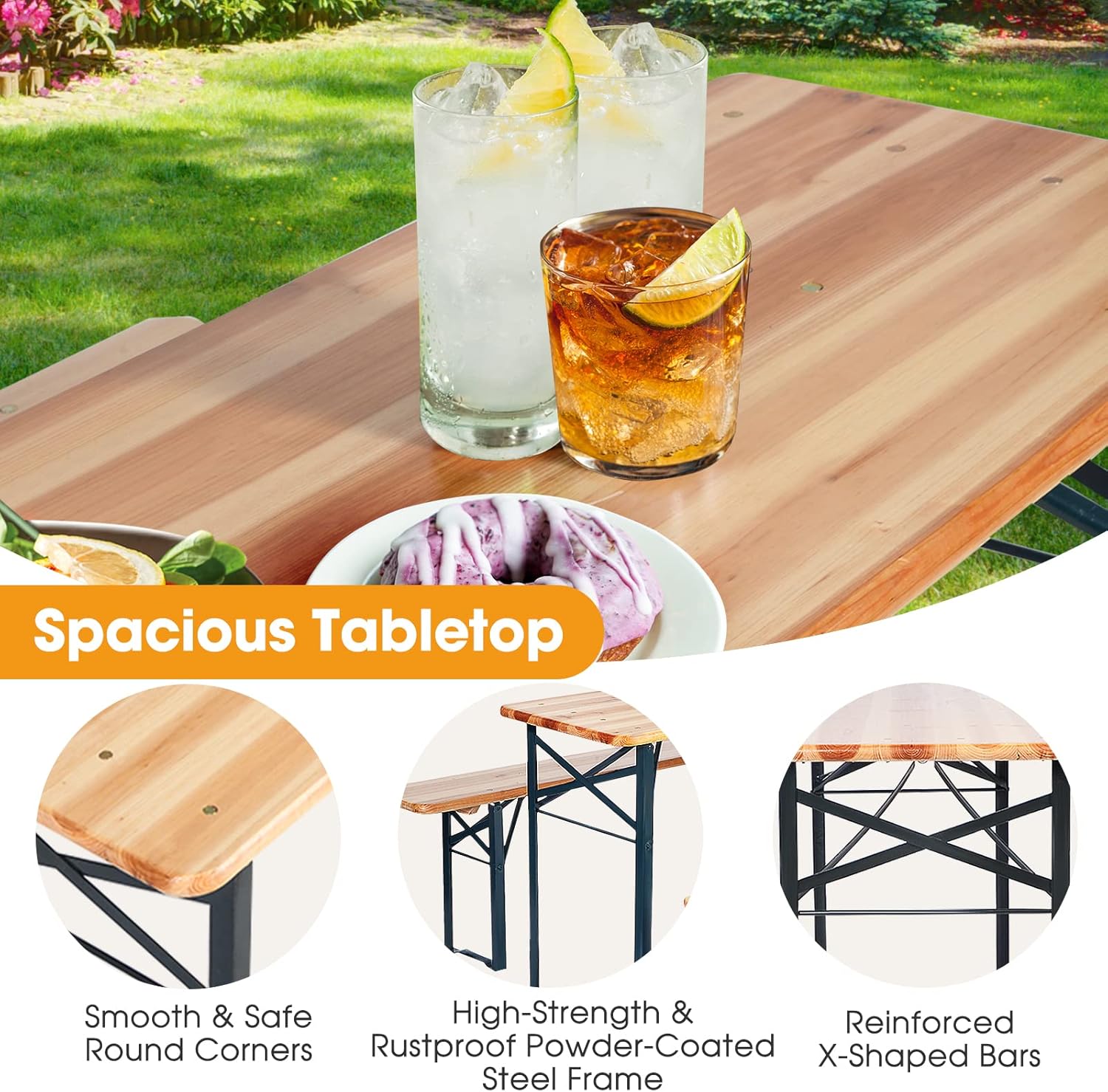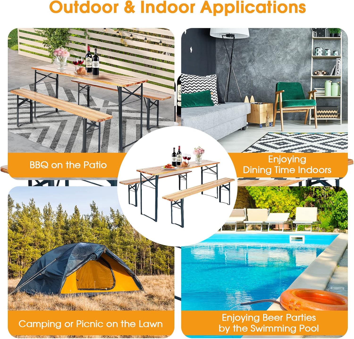 - This outdoor table and benches, including 1 wide table and 2 long benches, are perfect for outdoor activities such as backyard parties, BBQs, picnics, and camping. What’s more, this table set with benches can also be used indoors as a dining table.
