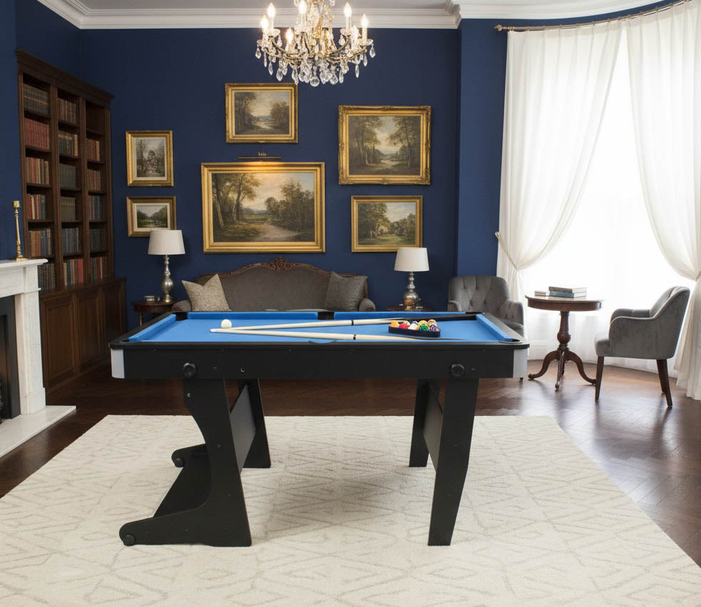 - This pool table is a great space saver; it can easily be folded up after use. Comes with a blue colour felt and blue tennis board.