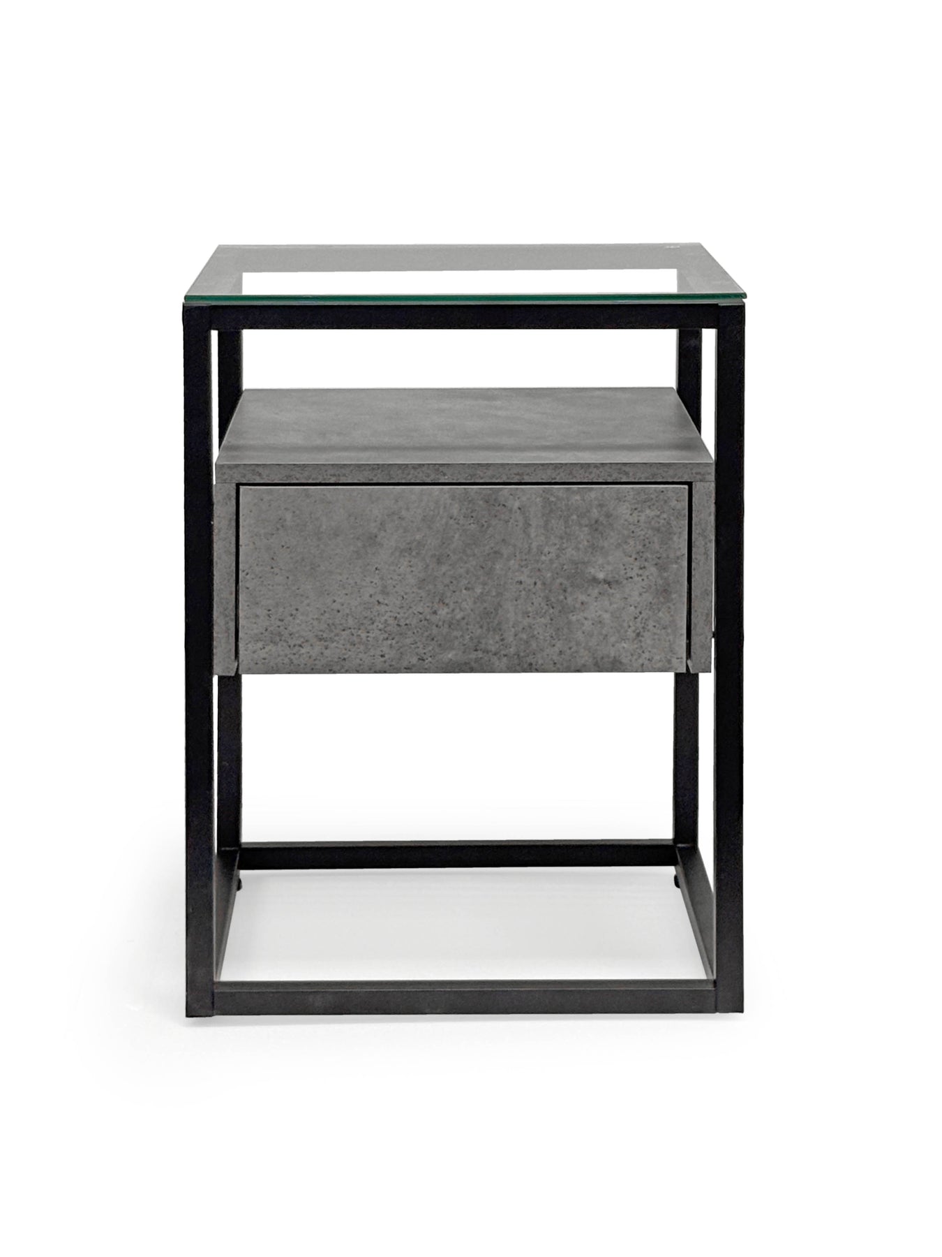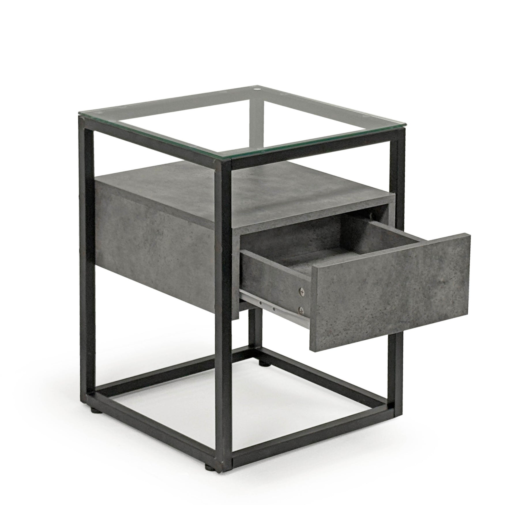 This square side table is sure to liven up your space. It features four black legs and a grey square cupboard with glass top.